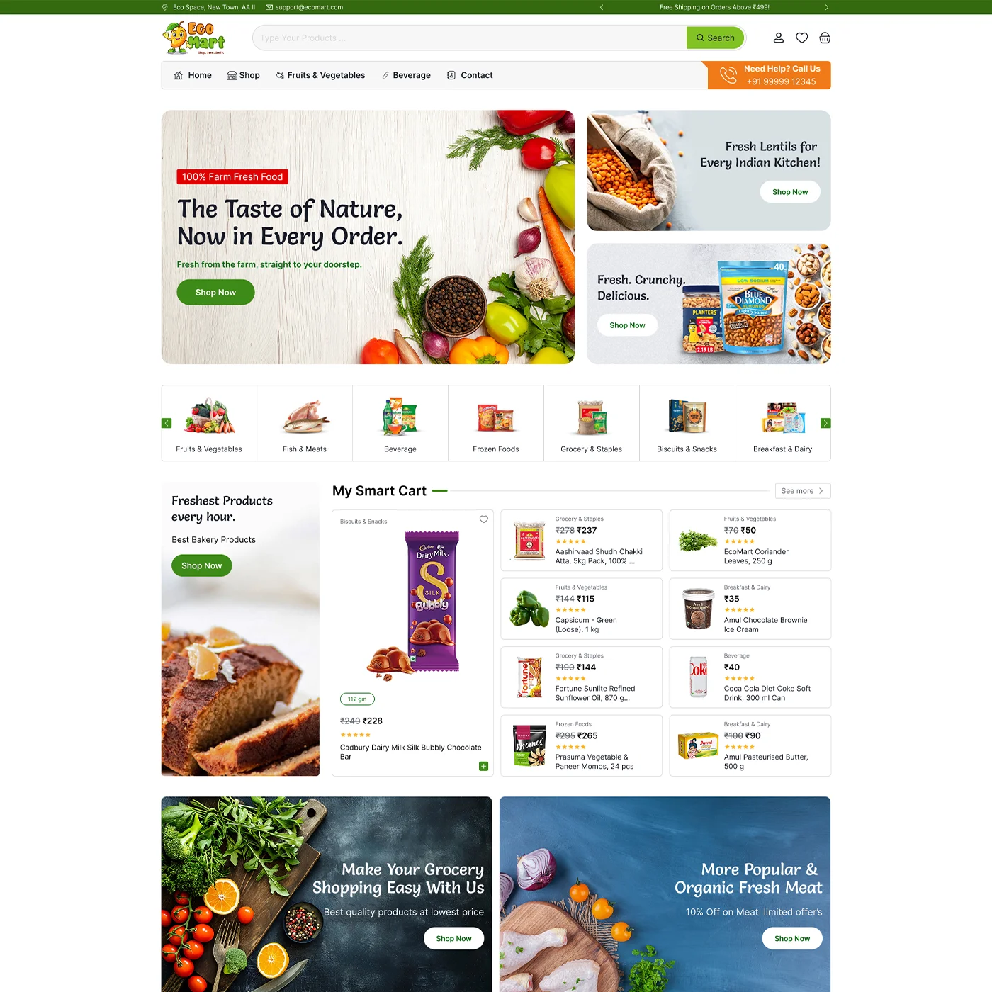 This headless Shopify React design delivers a clean, modern grocery shopping experience with a focus on fresh and organic products.